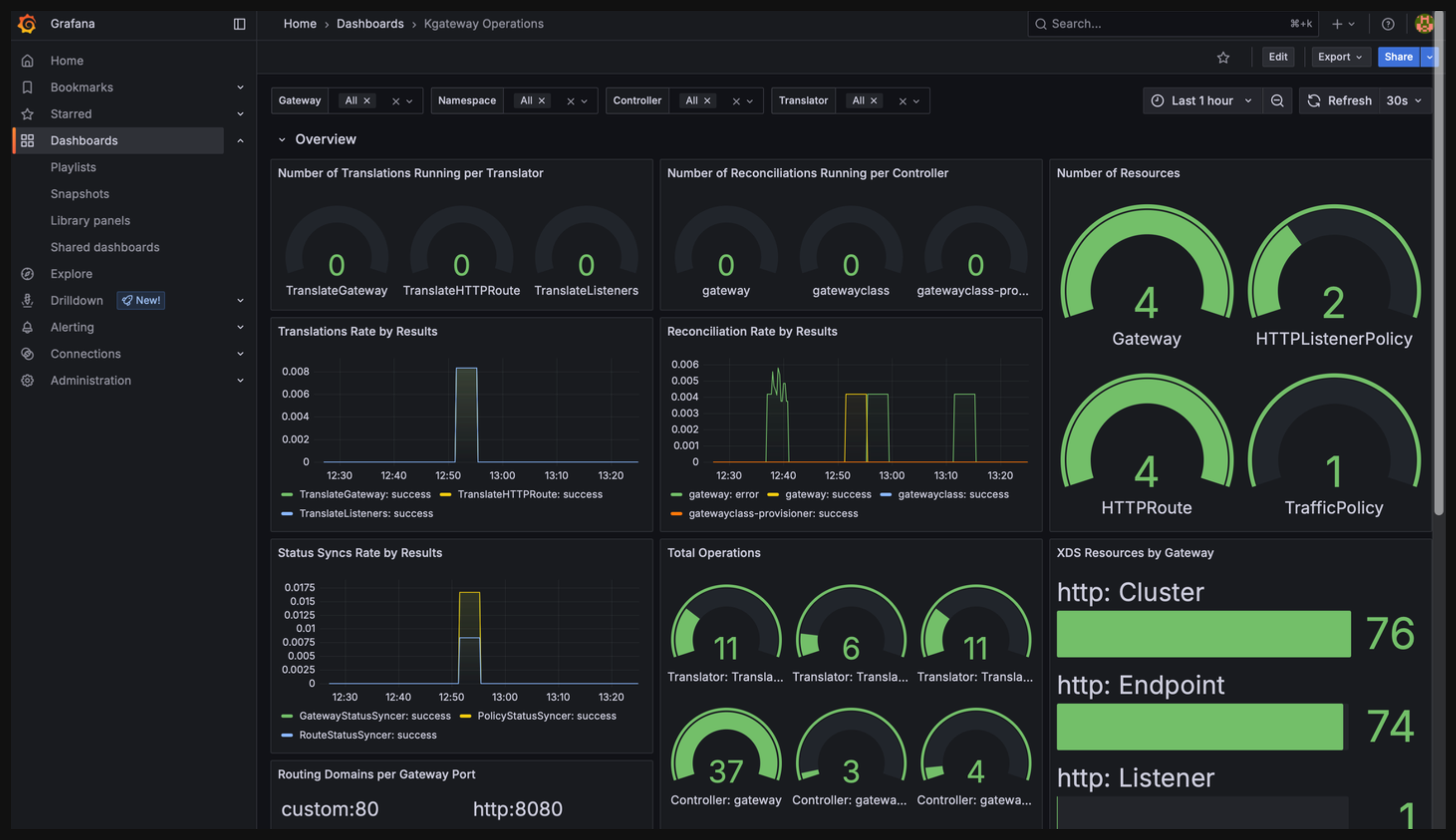 You can use the pre-built Grafana dashboards to observe the control and data plane statuses.